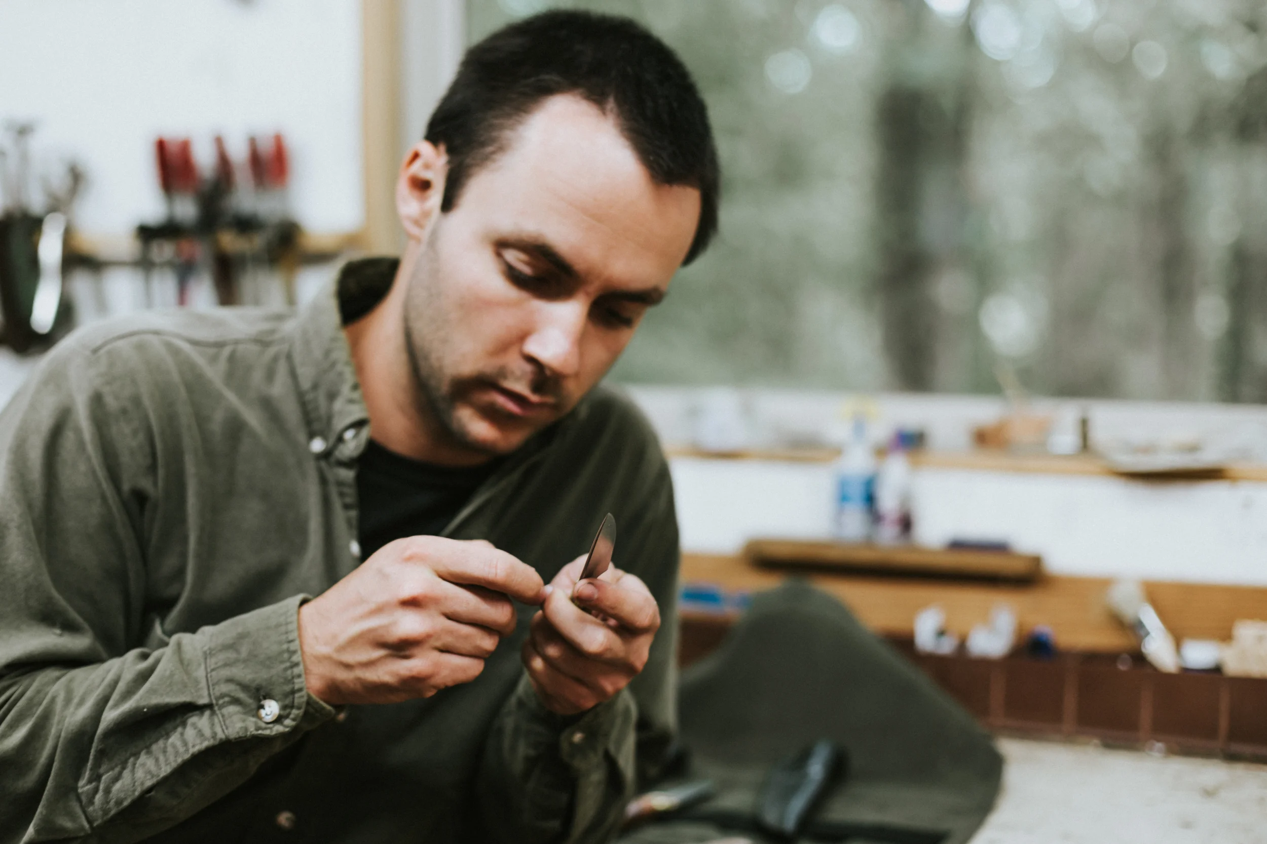 David holds his B.A. in Cello Performance, a Masters in English Literature and now works full-time as part of Bloodroot Blades. An avid hunter and cook, he and his wife Katy spend time taking care of their new little baby, Ada, tending their garden, and walking around the woods with their beagle Nicholas. David is also a skilled cellist and cello bow maker and restorer.