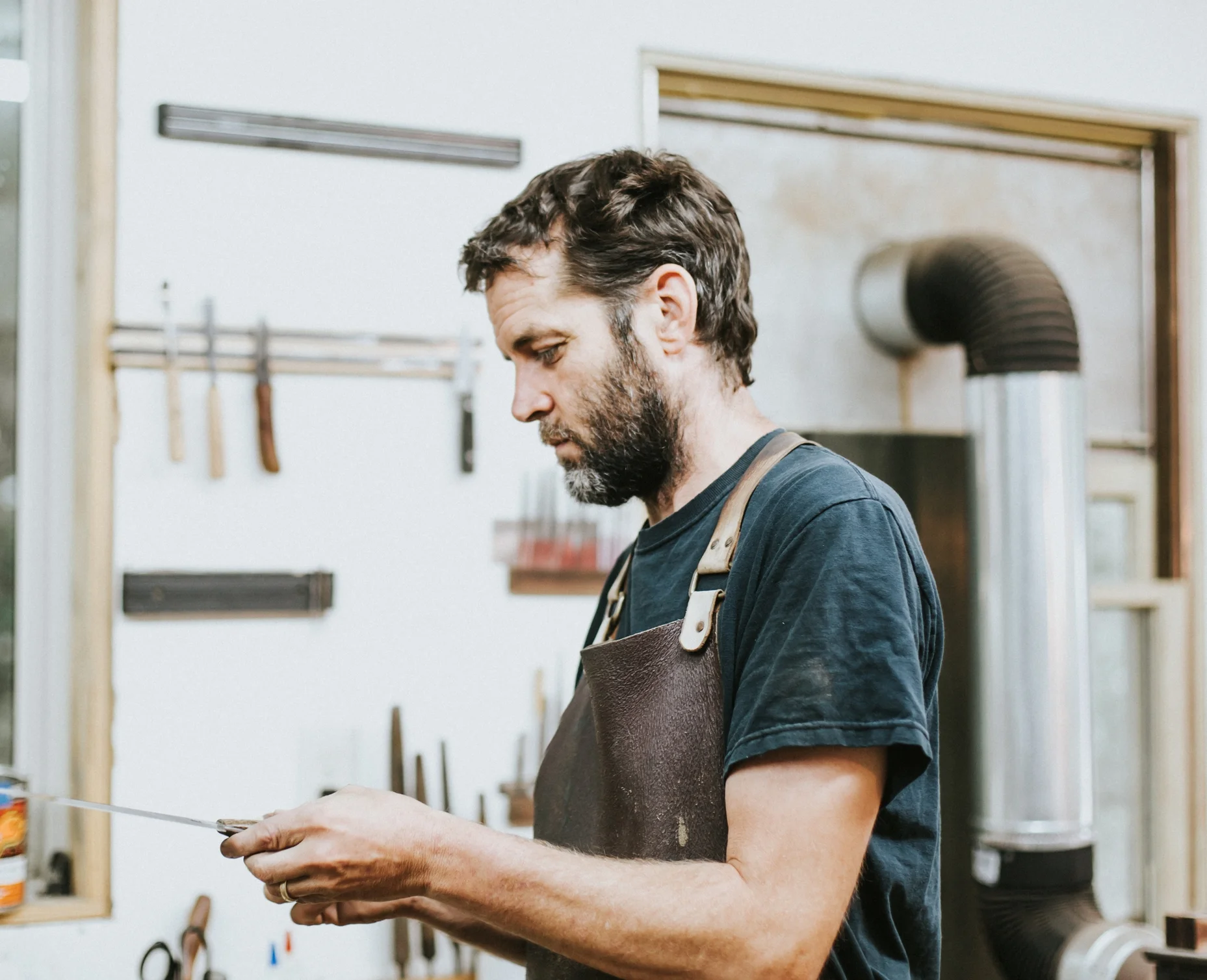 Luke began making knives and wooden objects with his father at a very young age. His father worked at a historical farm, where he was the blacksmith and woodworker in residence. Luke has always had kindred spirits in his parents and for most of his life had access to a coal forge and blacksmith shop that he made good use of - particularly in high school. At first, he made swords, daggers and the like just because they were cool. As he discovered hunting, camping, and manual work, he began crafting more utilitarian pieces like hunting knives. Yet it was only when then-acquaintance, David Van Wyk, requested a chef's knife that Luke discovered his passion for custom kitchen tools.